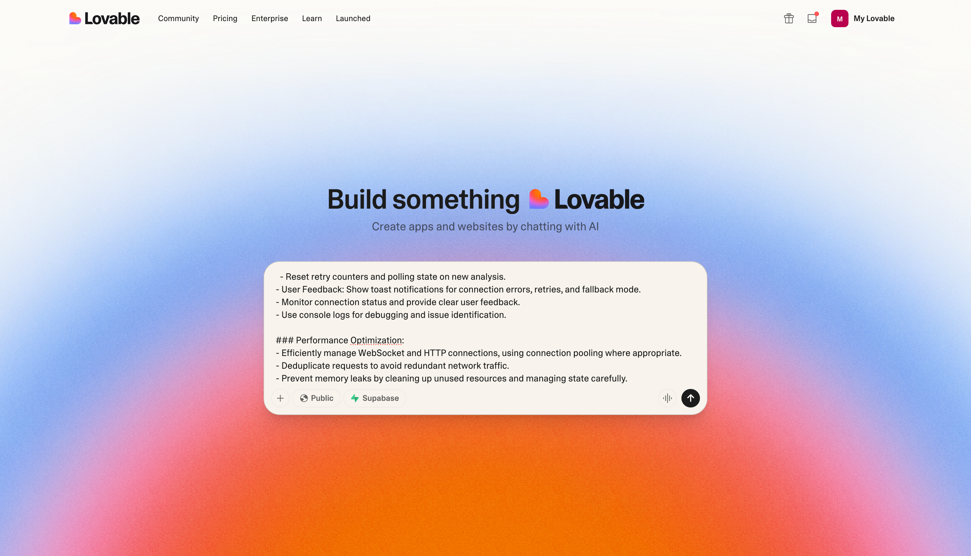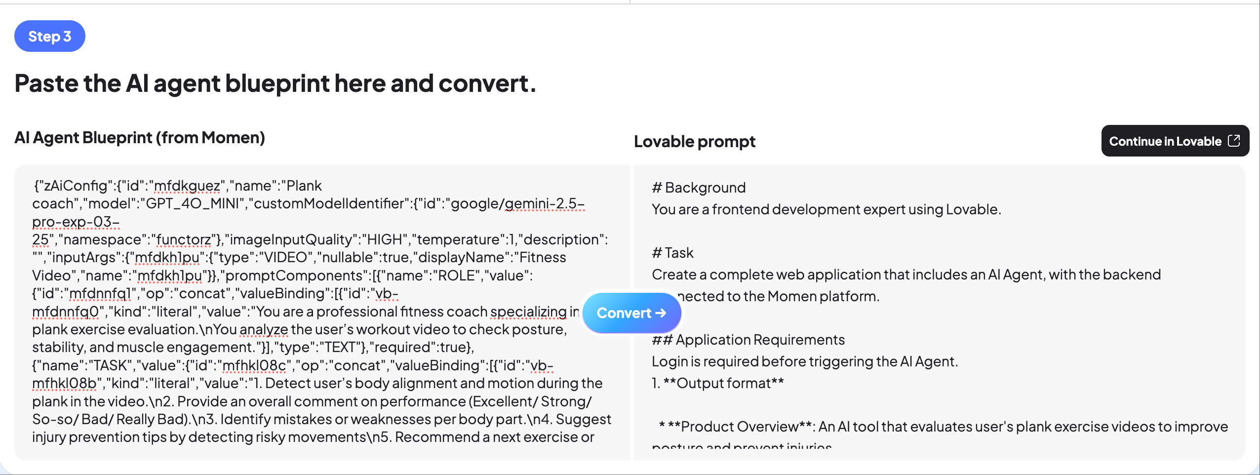 Go to Lovable, create a new app, paste the generated prompt, and watch Lovable spin up your front-end.