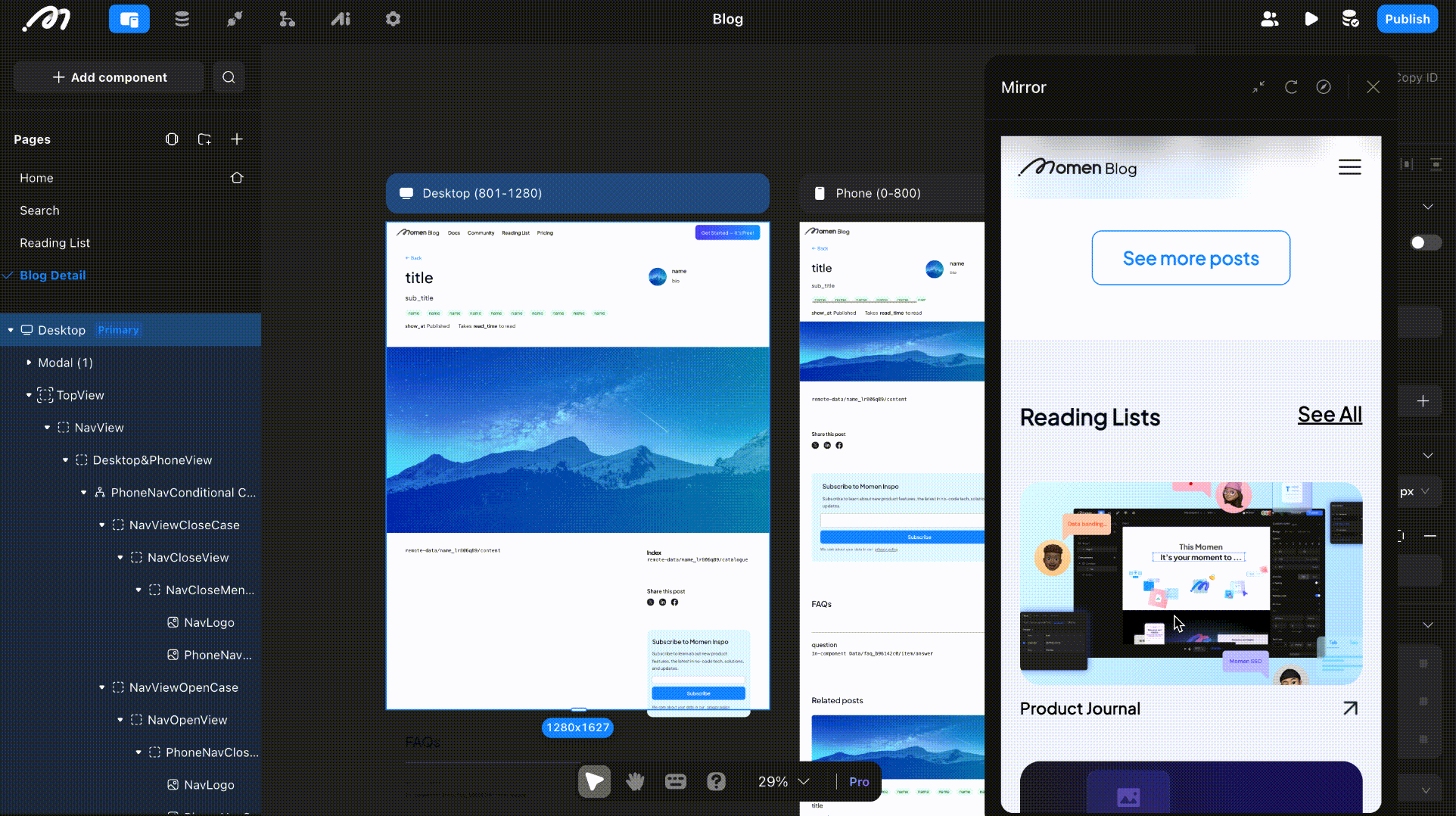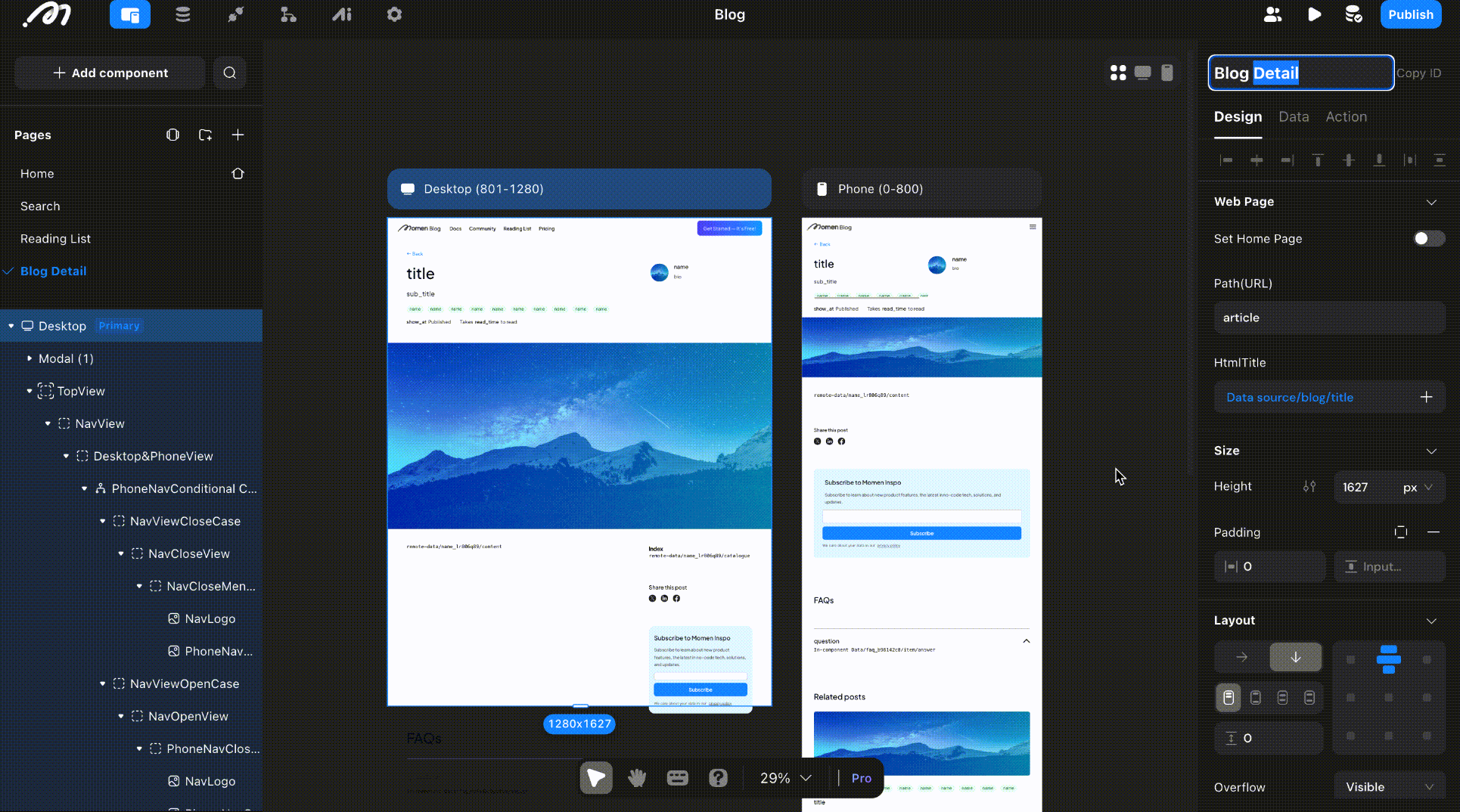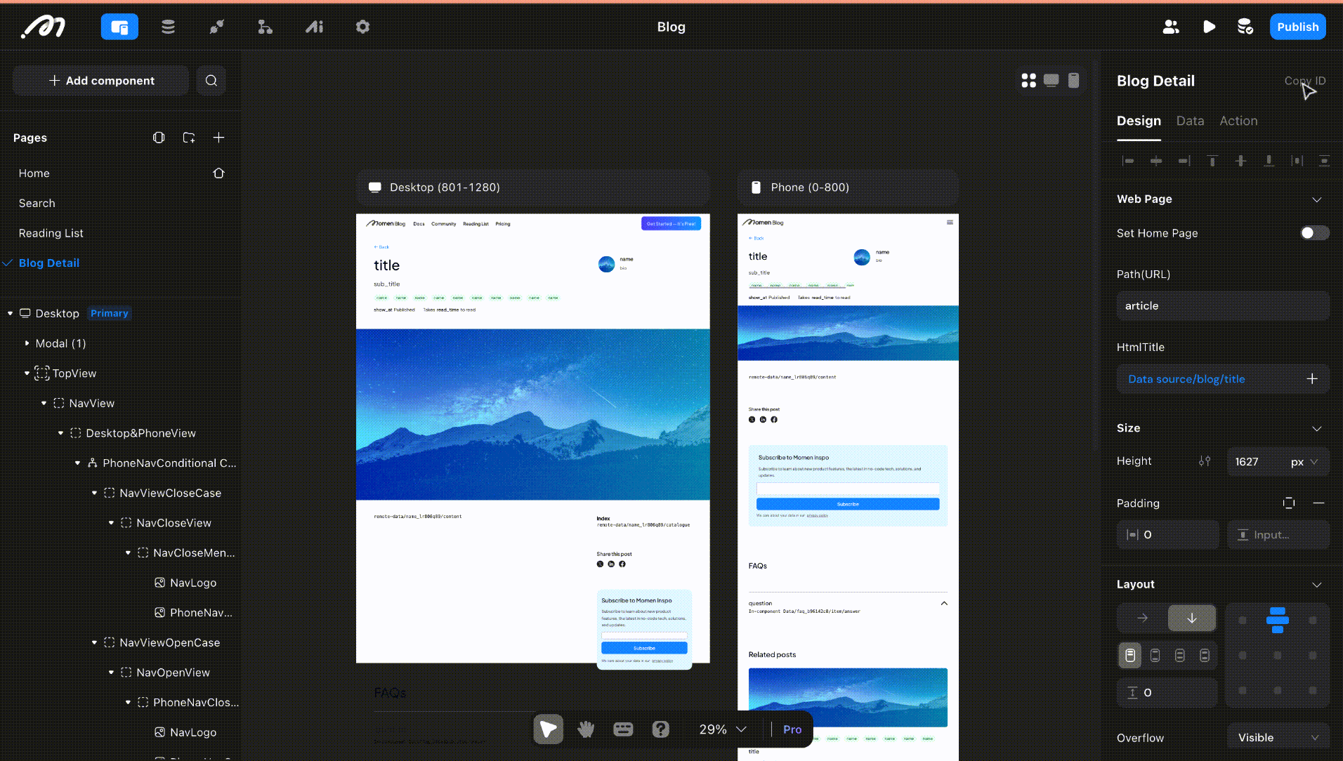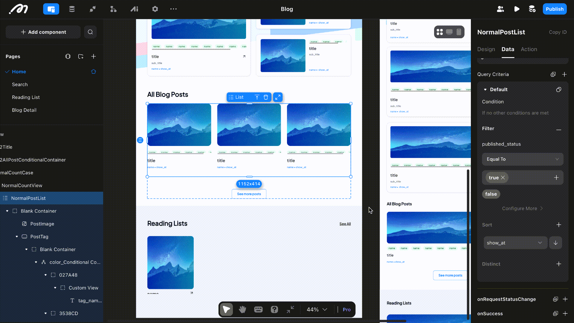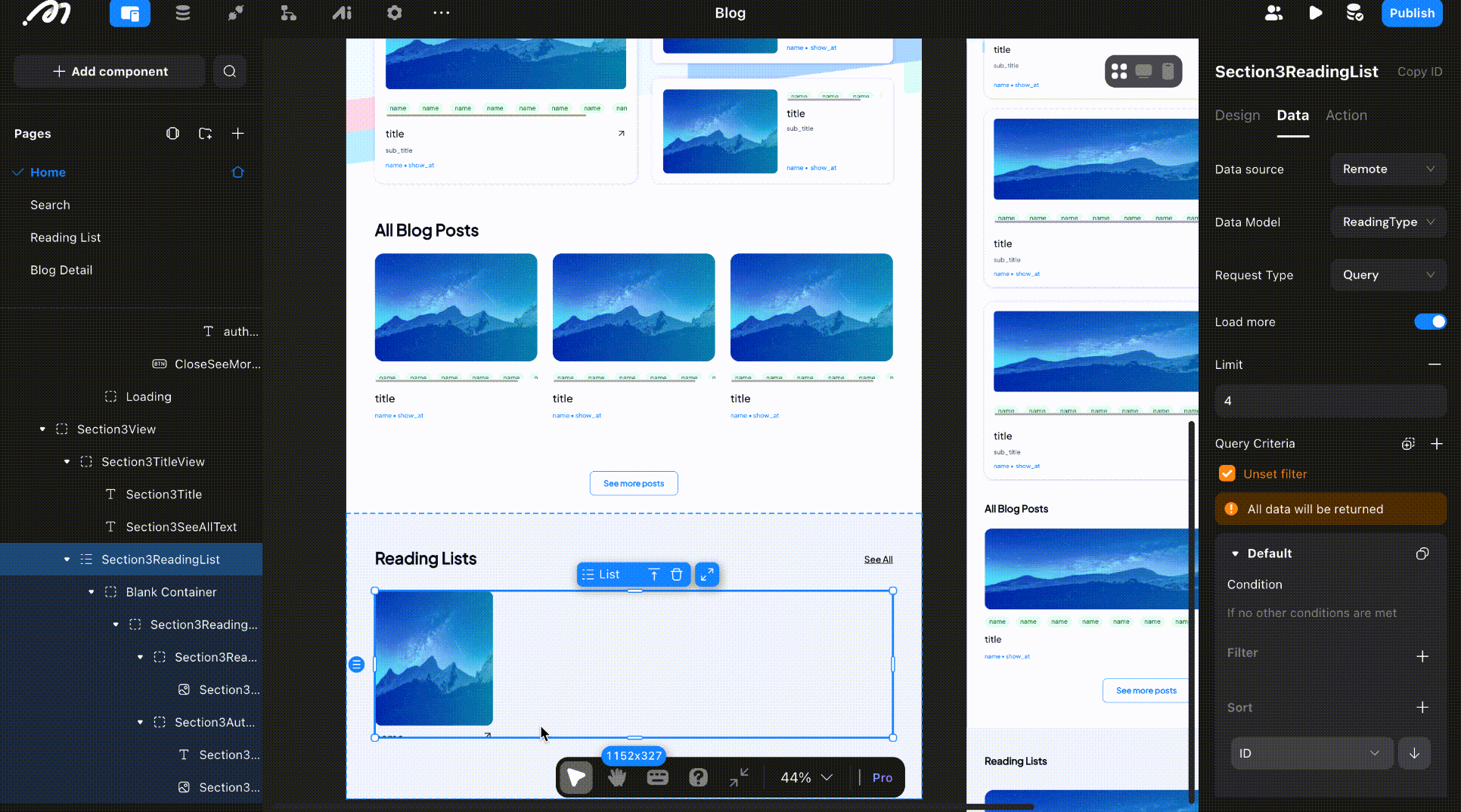 The blog has four main pages: Home, Search, Reading list and Blog detail. To build your UI, drag and drop components on your page and configure the settings for each component on the right side bar. In our blog, a key component is the list, which displays data in the same format dynamically.