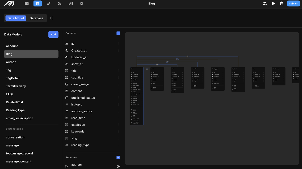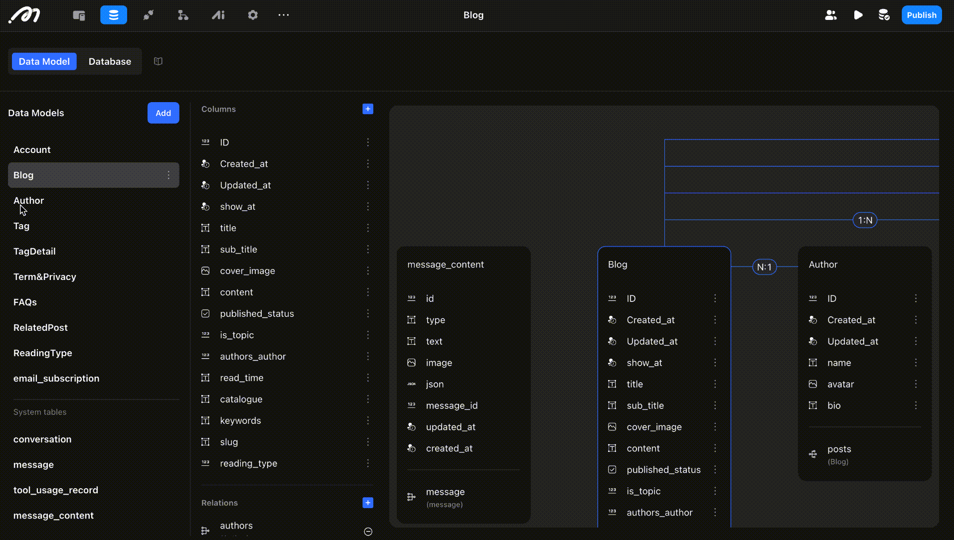 Author: Contains author information such as name, bio, and avatar. This establishes a 1:N relationship, allowing multiple blogs per author.