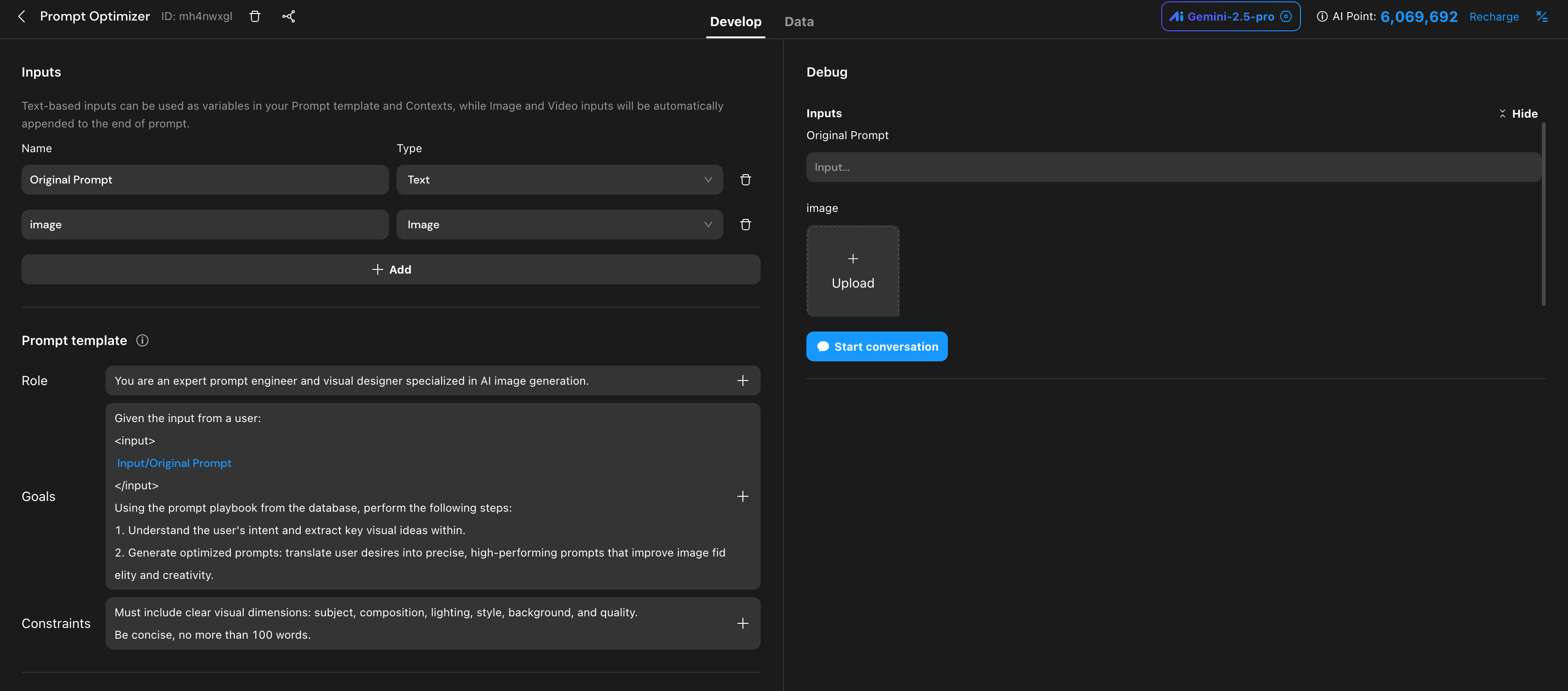 Provide a Playbook: Feed the agent a list of successful prompting rules (a "Playbook")—these are examples of effective structure, technical terms (e.g., lighting, lens type), and style requirements. This data trains the agent to consistently output high-quality, professional prompts.