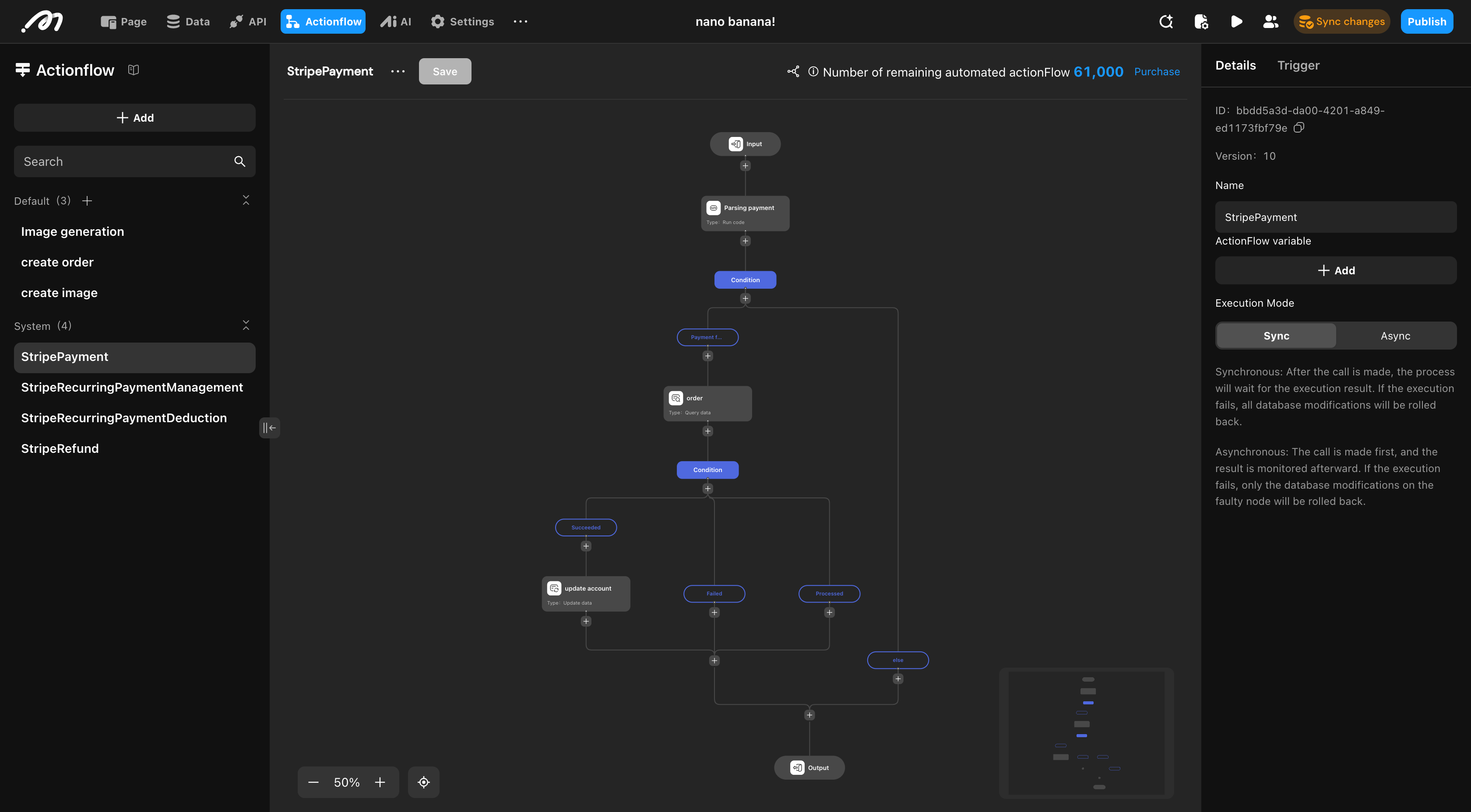 The core business logic resides in the backend workflow triggered when a user attempts to generate an image. This example uses a paywall that checks if the user has paid.