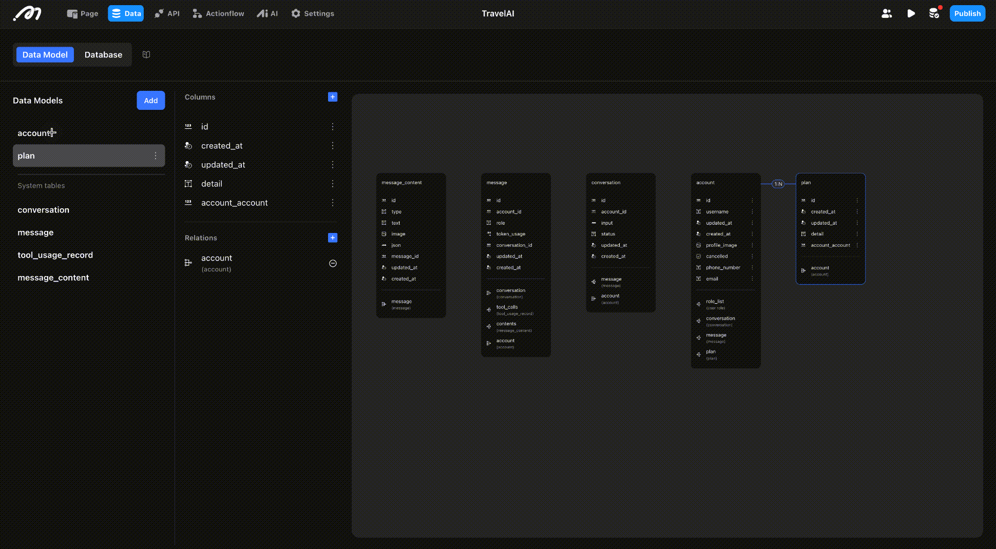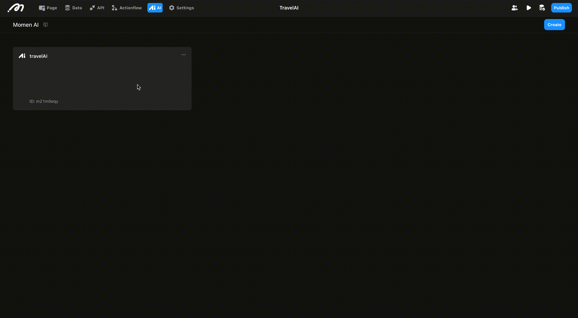Momen, with its built-in AI agent builder, lets you harness the full power of AI, including tool calls and RAG (Retrieval-Augmented Generation). As a complete no-code platform, Momen makes it possible to create a truly functional, commercial-grade chatbot tailored for real-world travel planning scenarios.