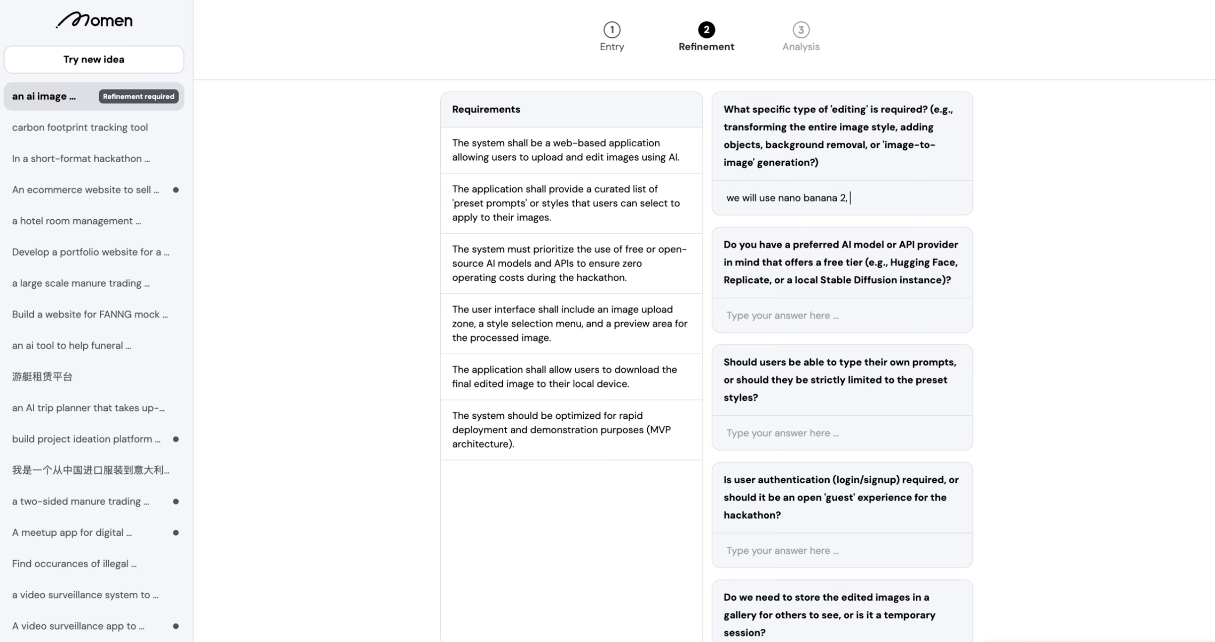 Before you touch the editor, you need a structured plan. To make this easy, you can use the Requirement Analyzer (a tool actually built on Momen). You simply type in your rough idea, and it turns your prompt into a professional project outline.