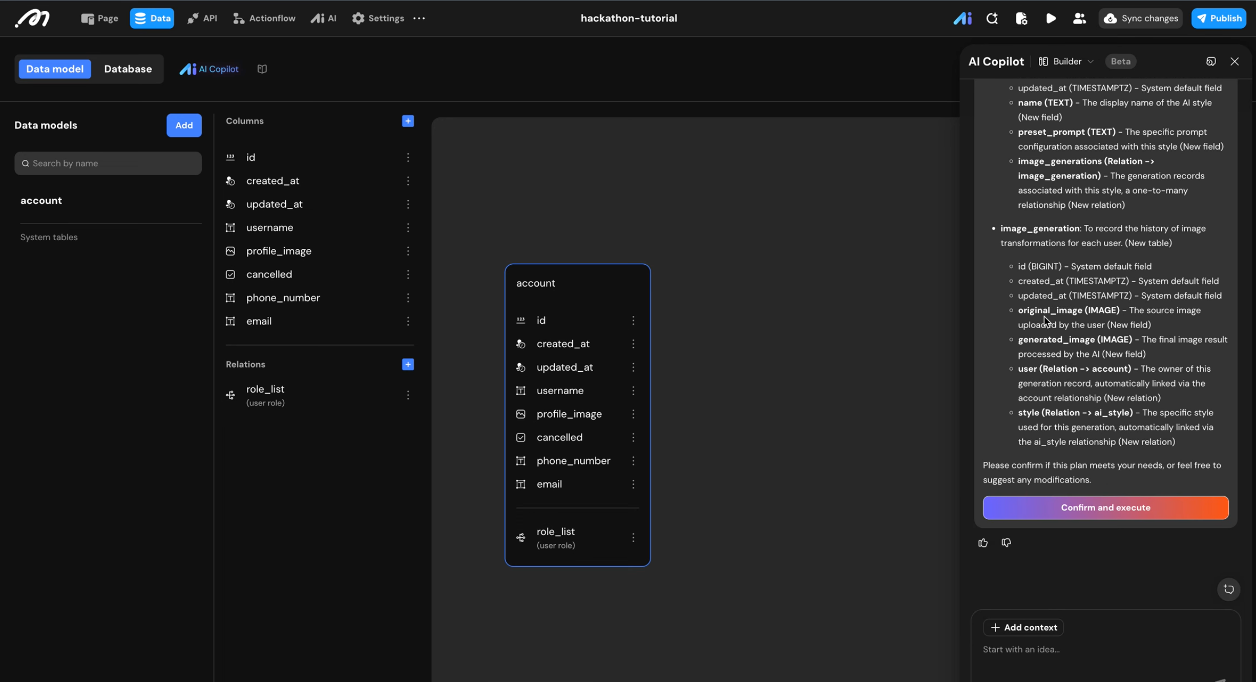 Apply the Schema: The AI will generate a Schema (a blueprint). Click "Apply" to automatically create tables like User, Styles, and History.