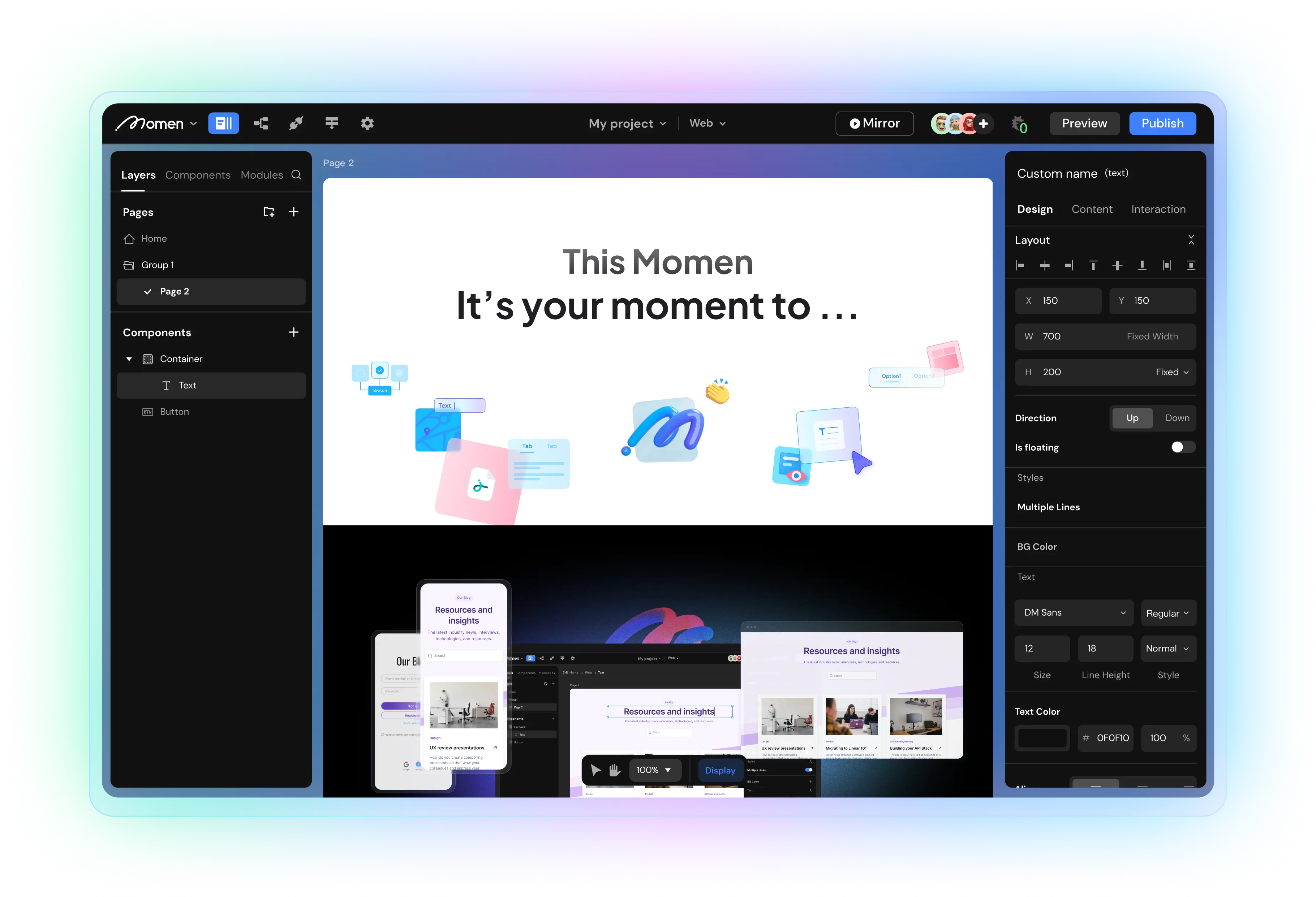Welcome to Momen – the site that lets you create, distribute, and manage your own website or online application, with no coding required. Momen is both a visual programming tool and a cloud platform. You use the programming tool to build your applications, while they are hosted and run on the cloud platform. The application editor is accessed through your browser. There is nothing to download, and you can access your application from any device. Once an application is built on Momen, there is no need to deploy the application to a cloud solution. As soon as an application is built on Momen, it is hosted on Momen's cloud infrastructure.